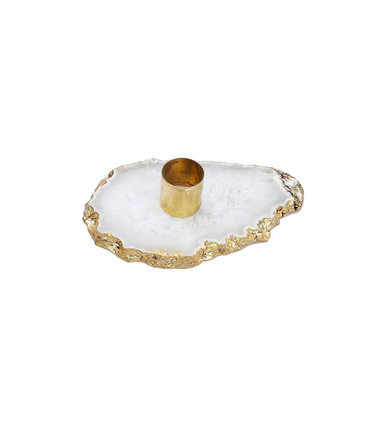 Found naturally in Earth -the agate stone, a semiprecious stone- is organically marbleized with beautiful hues and designs. It features a brass cup to hold the candle and a brass border edging the holder.