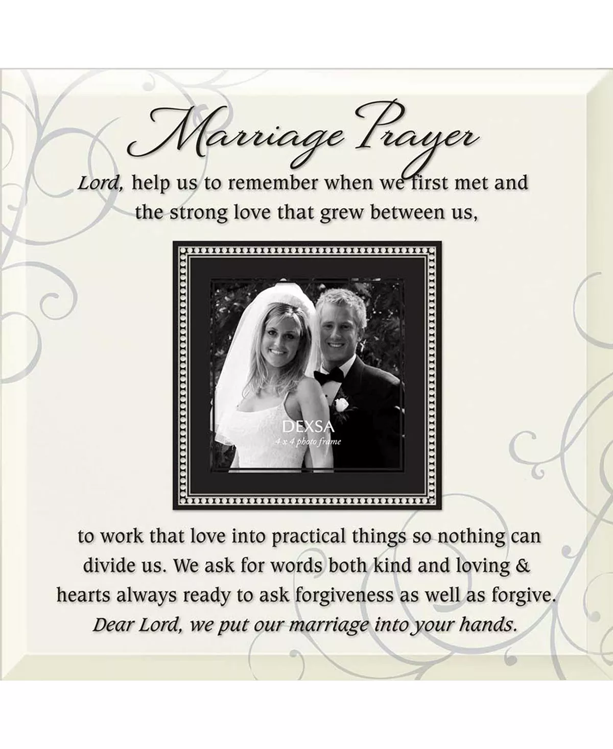 Marriage prayer beveled glass photo frame with easel. Beveled glass photo frame comes easel-backed and fits a 4″x 4″ photo.