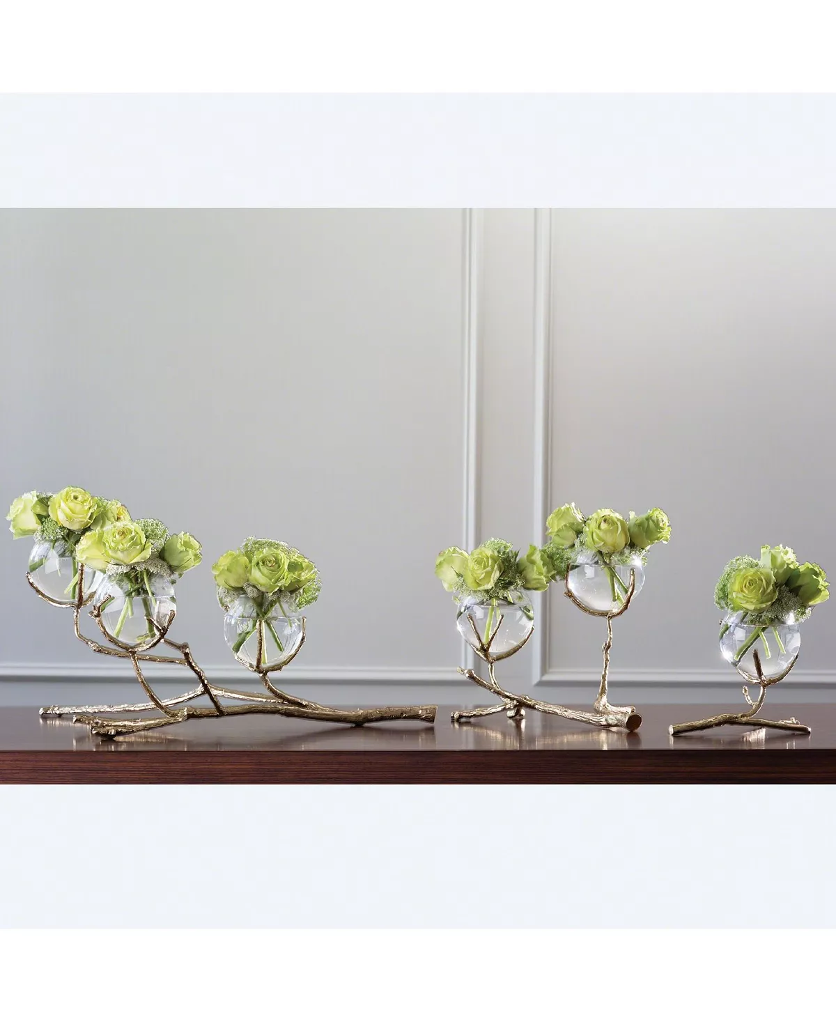 Stems of solid sand-cast brass twist and turn creating our twig vase holders. These delicate vase holders have taken natural elements and turned them into glowing artful accessories. The glass bulb-shaped vases display small buds beautifully. Display one piece for a simple look or show all three sizes together for a dramatic tablescape.