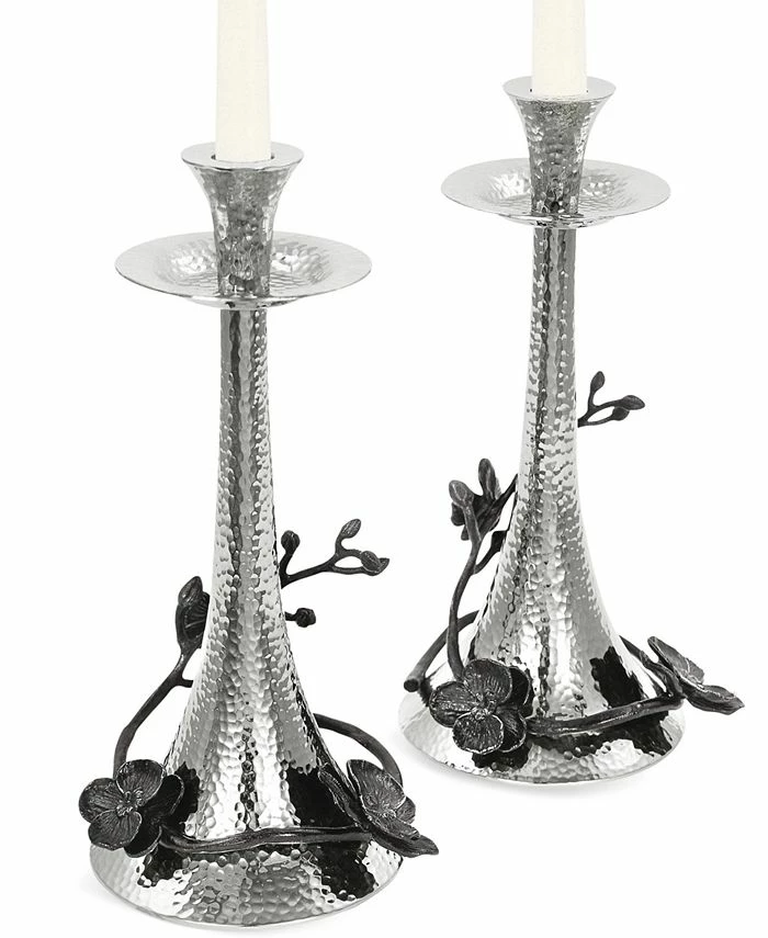Inspired by the intricacies of foliage from around the world, Michael Aram’s Black Orchid candle holders cast exotic florals in an unexpectedly dark yet graceful role. Hammered stainless steel reflects nickel-plated blossoms wrapped around a fun, flared base.