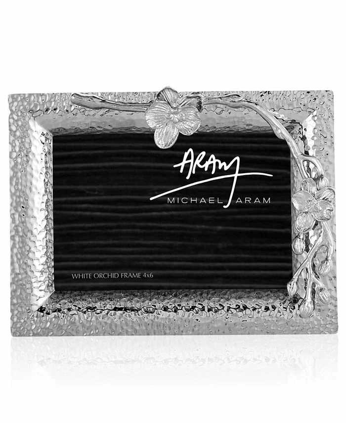 Embodying the purity and grace of orchids, the White Orchid picture frame is a work of art. Sculptural flowers juxtapose hammered metal in this elegant design by Michael Aram.