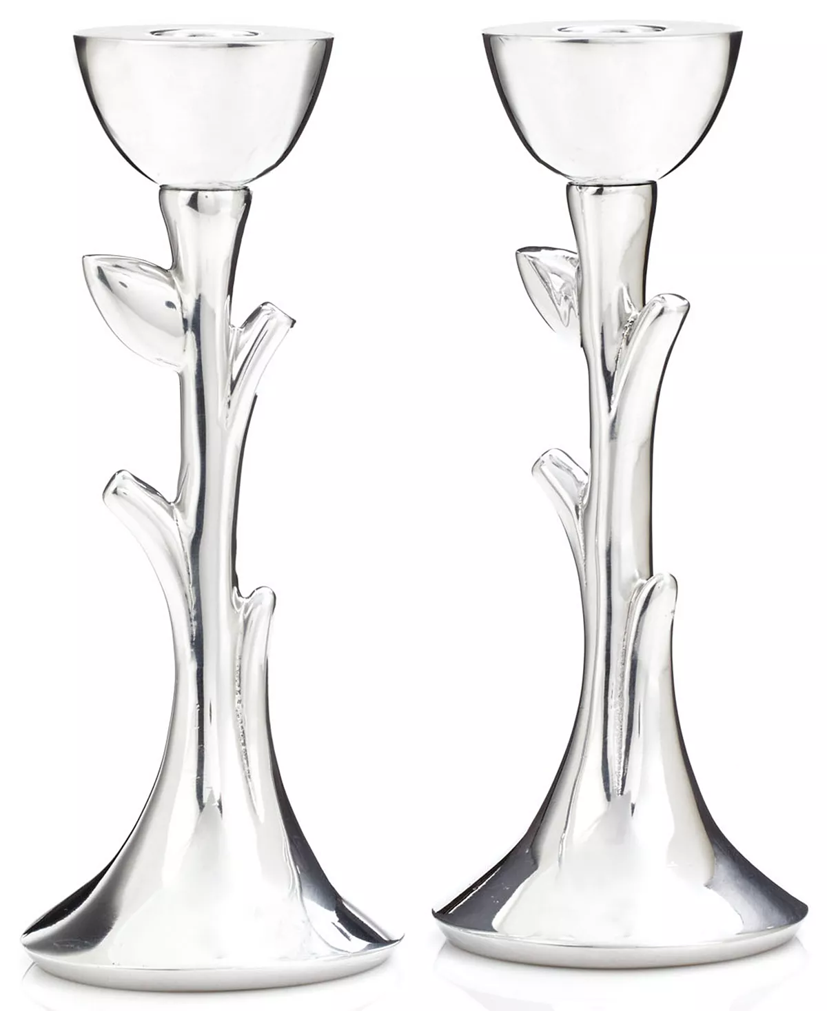 These lustrous Sabbath candlesticks by designer Marilyn Davidson have a subtle, sculptural quality that gives them the appearance of stretching toward the sky. From Nambe.
