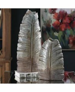 Set of two ceramic candleholders are finished in a vertically striped ivory and cobalt glaze, accented by iron candle cups finished in polished nickel with two 4″ x 3″ distressed off-white candles included.